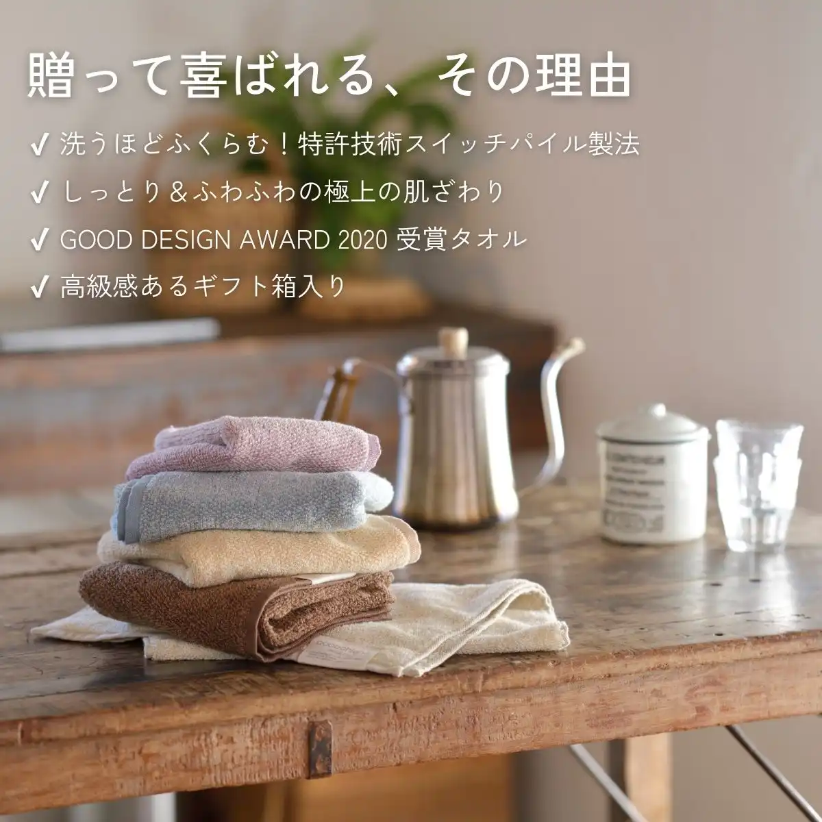 タオル本来の用途として拭くということだけではなく使うたびに変わらない“心地良さ”があります。やわらかく、しなやかでボリュームがあるにも関わらず軽さを感じる使い勝手の良いタオルです。使ったその時、心にプラス、“心地良い”ひとときをご提案いたします。