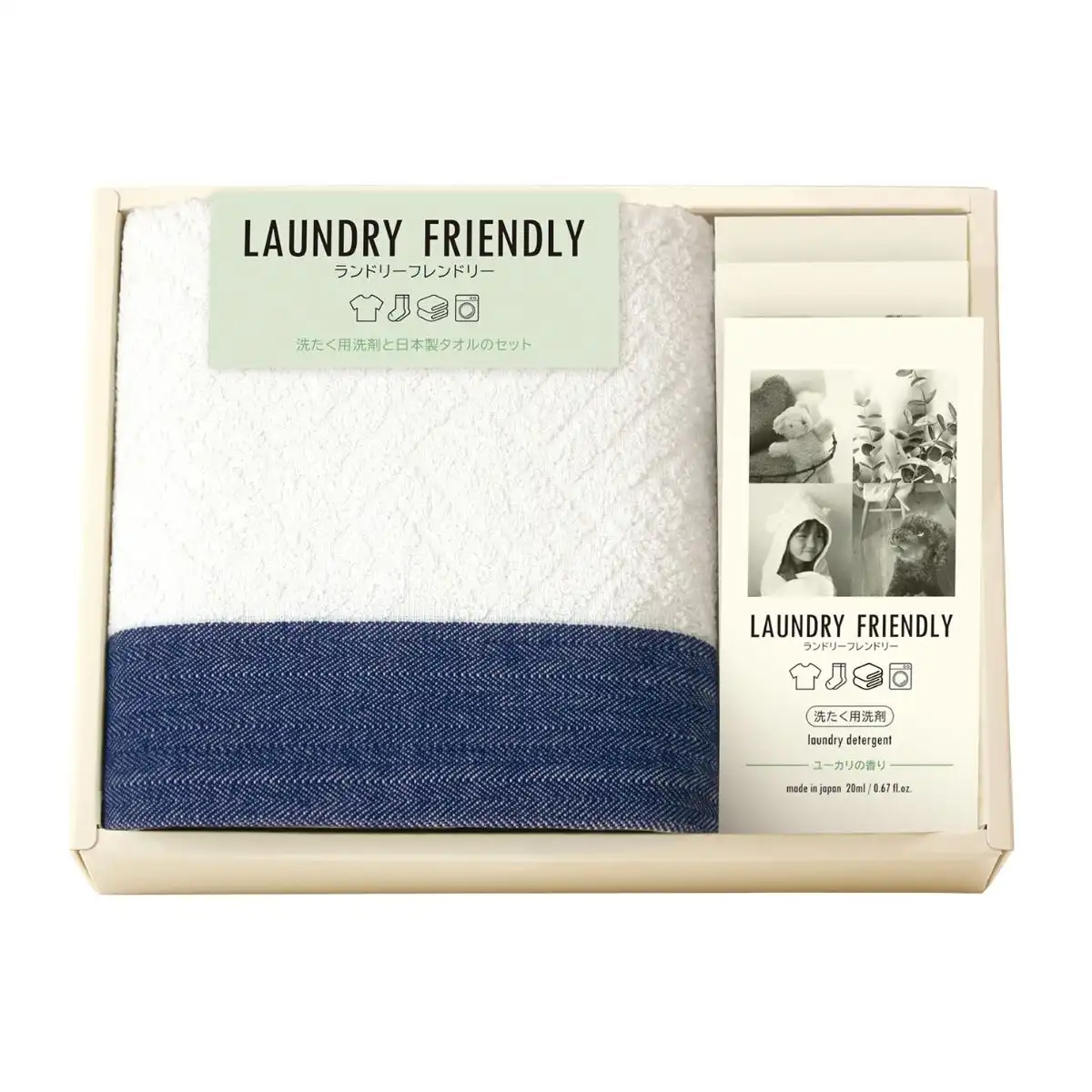 環境にやさしく仕上げる爽やかなユーカリの香りの洗濯用洗剤と、ネイビーの差し色がお洒落な日本製タオルとセットのギフトです。