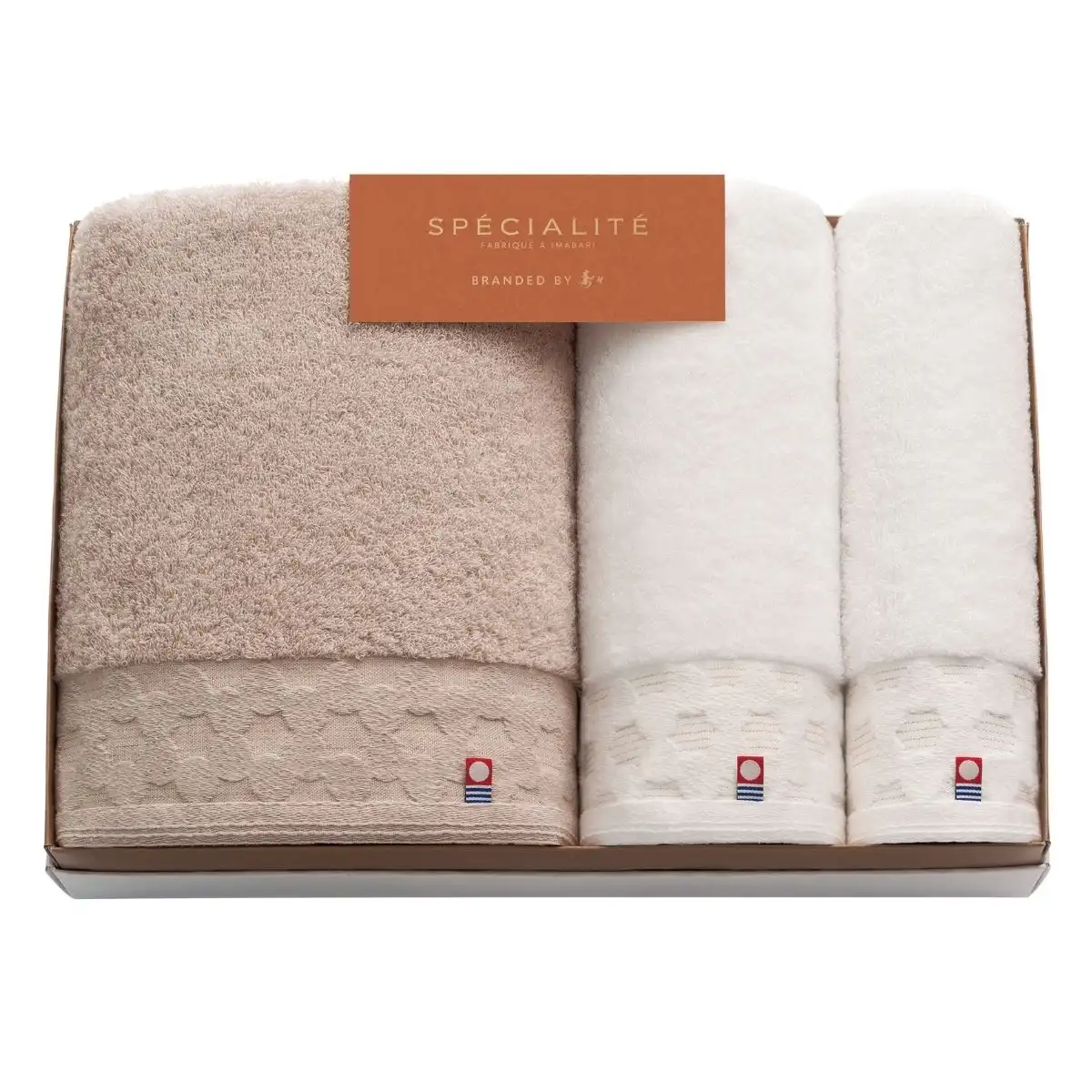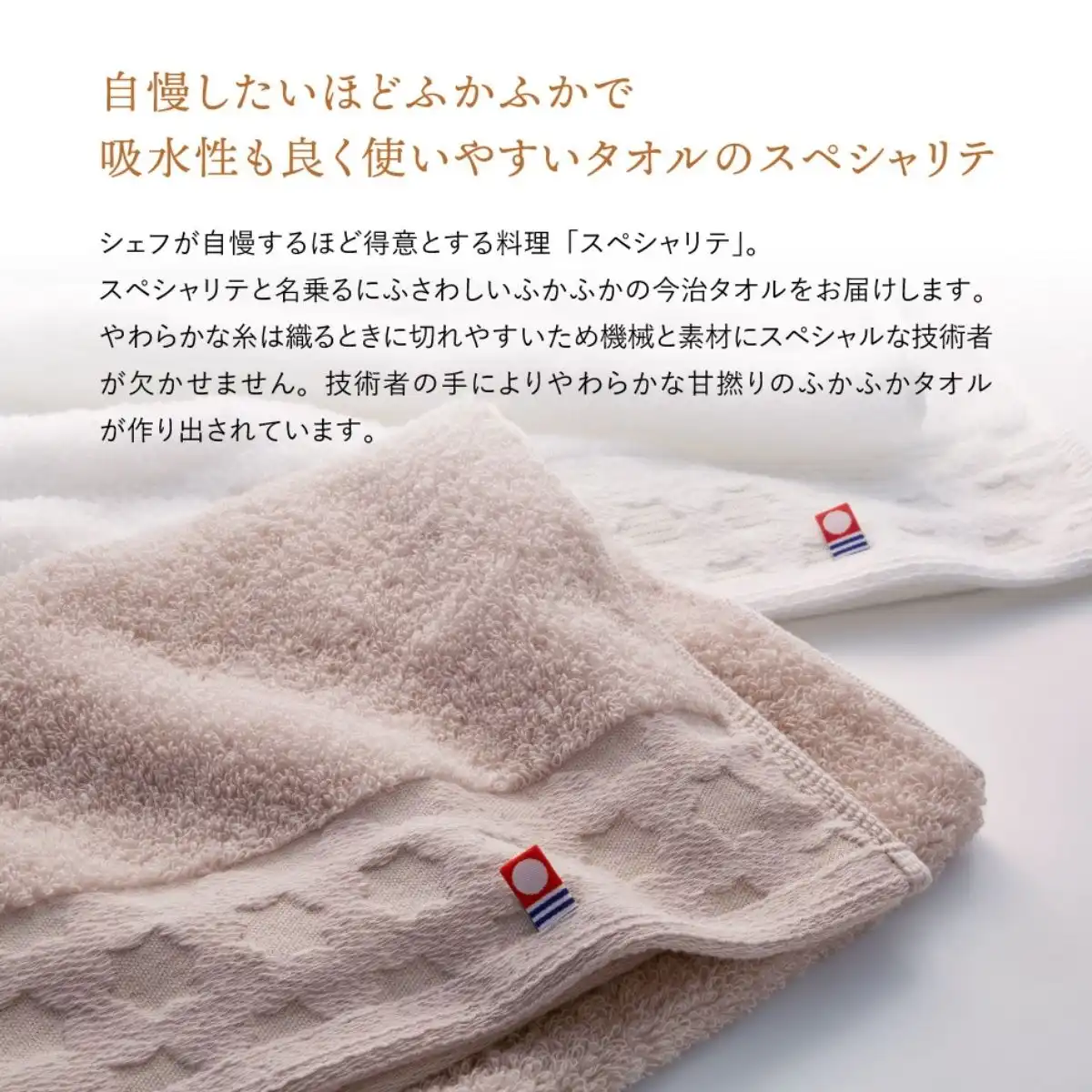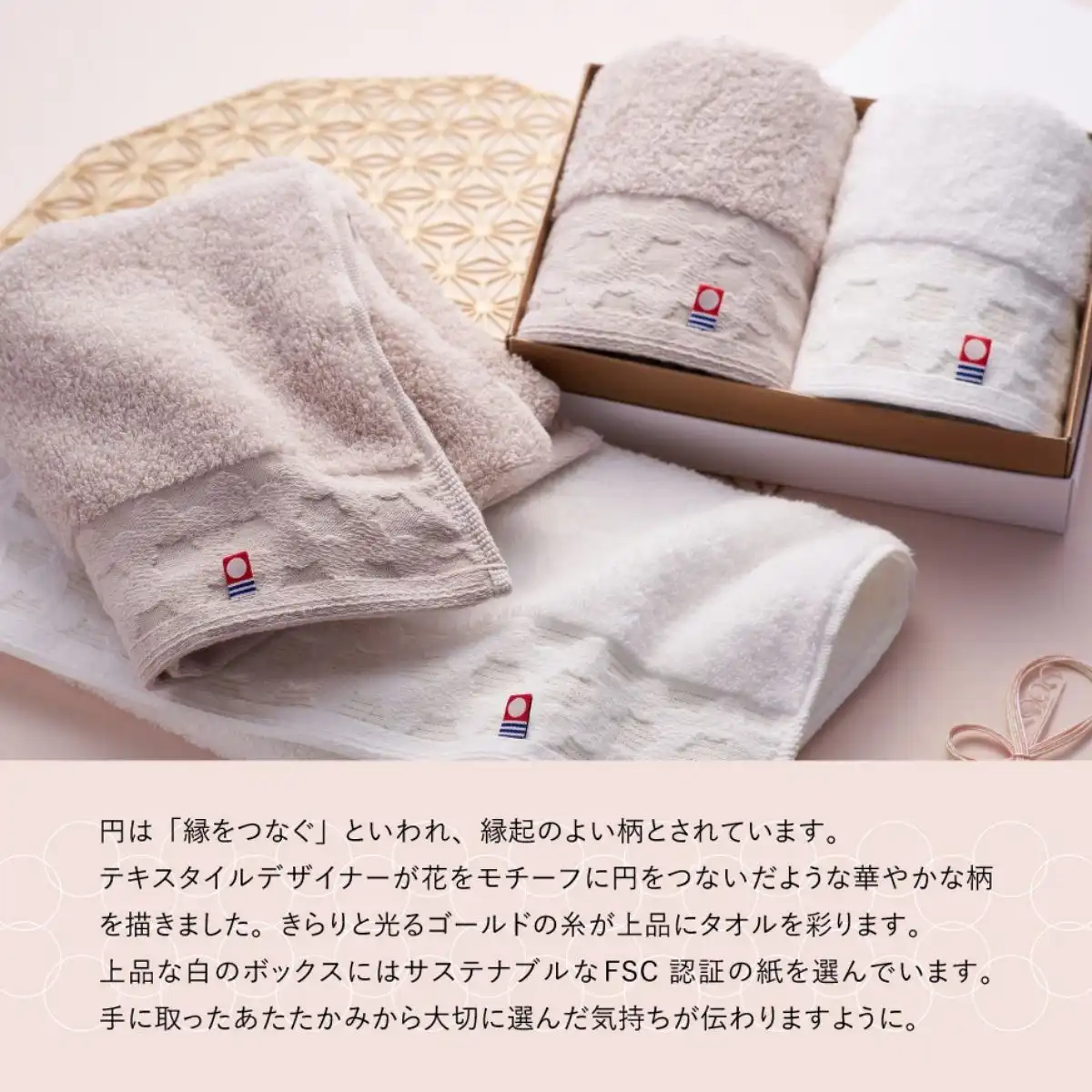 フランス語でシェフが自慢するほど得意とする料理を「スペシャリテ」と呼びます。スペシャリテを名乗るにふさわしい、スペシャルな技術者が織り上げたやわらかくふかふかな今治タオルです。花をモチーフに円をつないだような華やかな柄が描かれ、さらりと光るゴールドの糸が上品にタオルを彩ります。結婚の引出物・内祝い、出産の内祝いの贈り物はもちろん様々なギフトにお勧めの商品です。