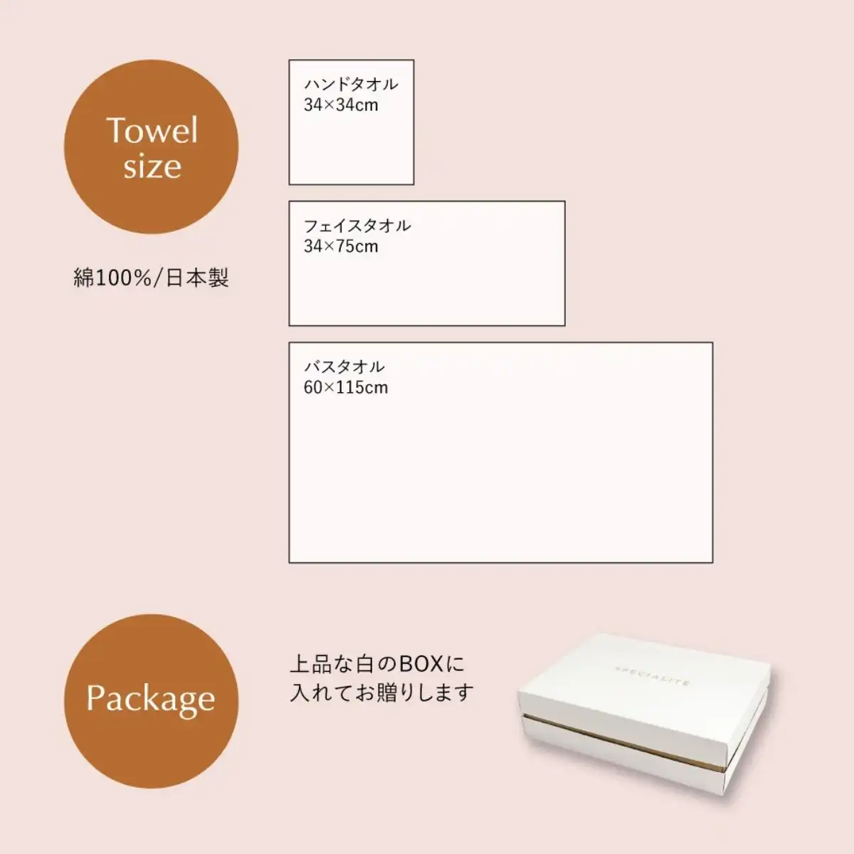 〇商品サイズ:バスタオル約60×115cm、フェイスタオル約34×75cm、ハンドタオル約34×34cm