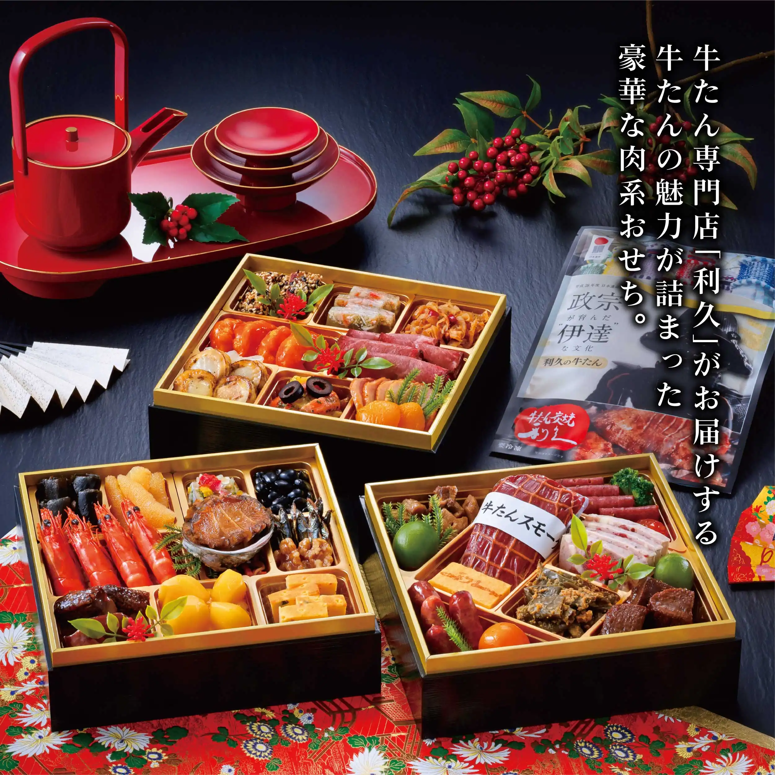 牛たんの魅力を詰め込んだ贅沢おせち。お重には利久自慢の牛たん料理を盛り込み、さらに牛たん真空パック1パックをセット。牛たんの旨みを心ゆくまで堪能できる特製おせち料理。定番の和食はもちろん、洋風・中華メニューも取り入れ、お子様からご年配まで幅広く楽しめるバラエティ豊かな内容です。