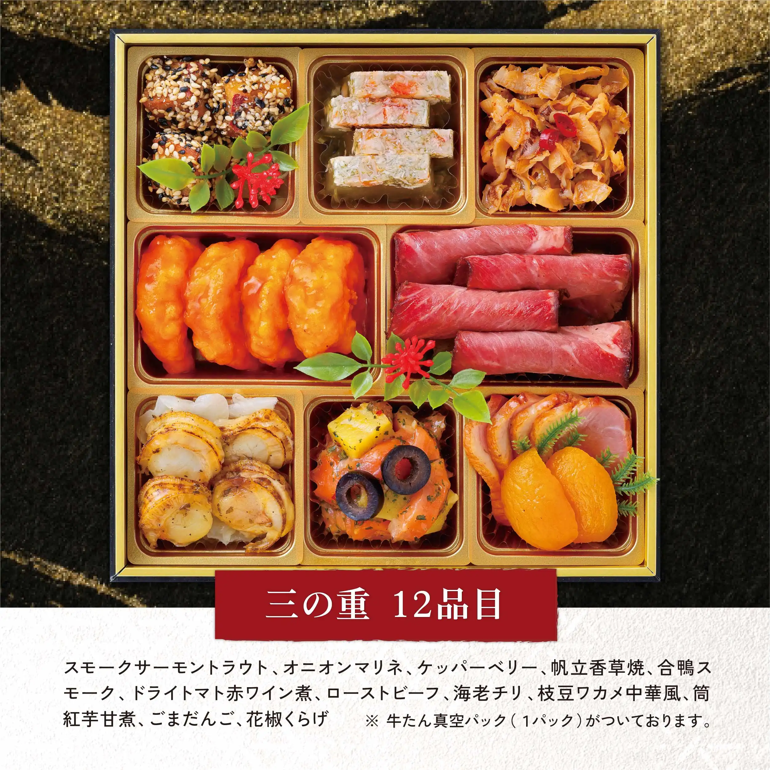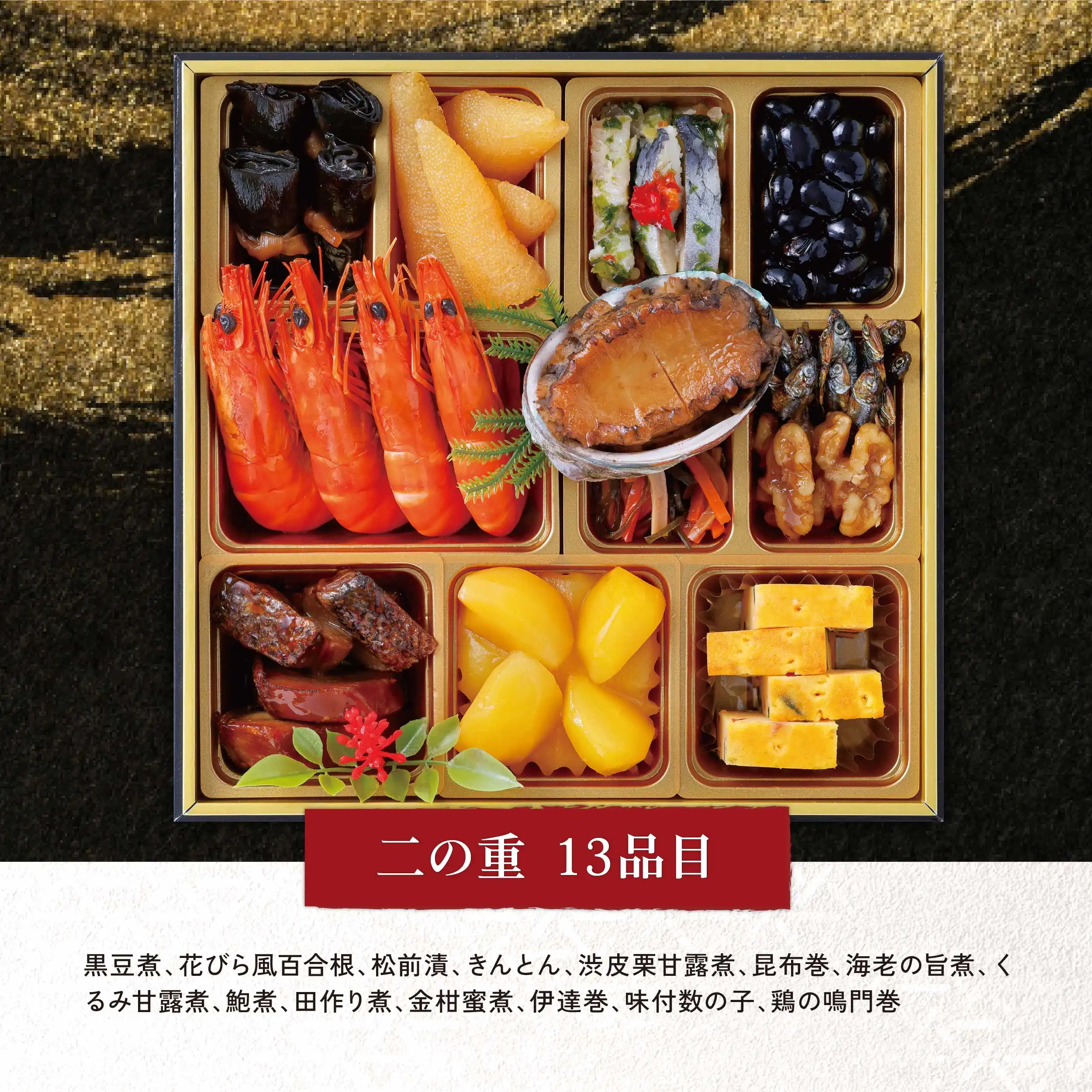 (1)昆布巻4個(2)味付数の子(3)にしんレモンマリネ(4)黒豆煮(5)海老の旨煮(6)鮑煮(7)松前煮(8)田作り煮(9)くるみ甘露煮(10)ぶり照焼き(11)きんとん(12)栗甘露煮(13)チーズふくさ焼