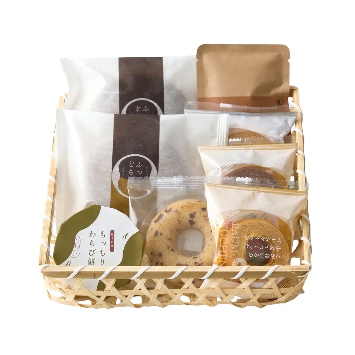 北海道産小豆を使用した餡をふっくらとした生地で包み込んだどら焼きやもっちりつるんとしたわらび餅に、優しい甘さの小豆の焼きドーナツと層を重ねる3種類のバームを手作りの竹籠で包みました。セットで入っている有機焙じ茶と一緒にホッとひと息する時間をお過ごしいただけるギフトセットです。