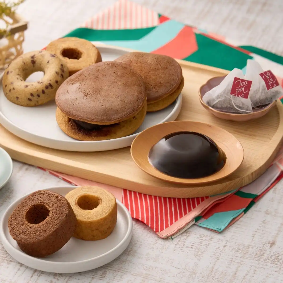 〇商品内容:ふっくらどら焼き×2個、もっちりわらび餅・ふんわりバームクーヘン(ミルク・ココア・黒糖)・小豆焼きドーナツ×各1個、有機焙じ茶(6g(2g×3包))×1袋