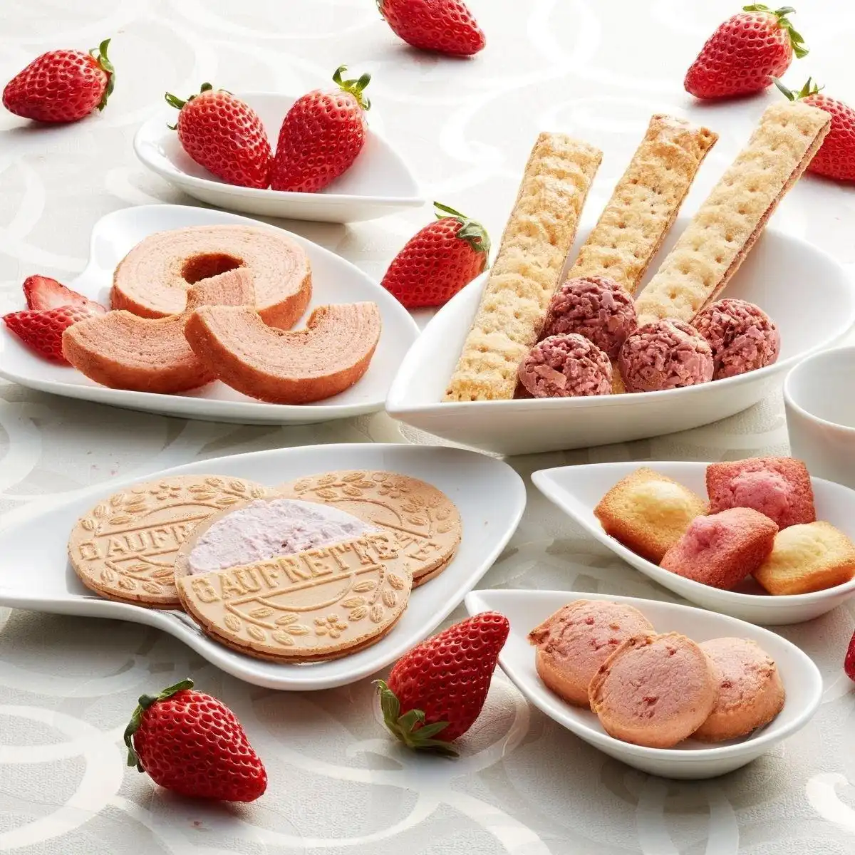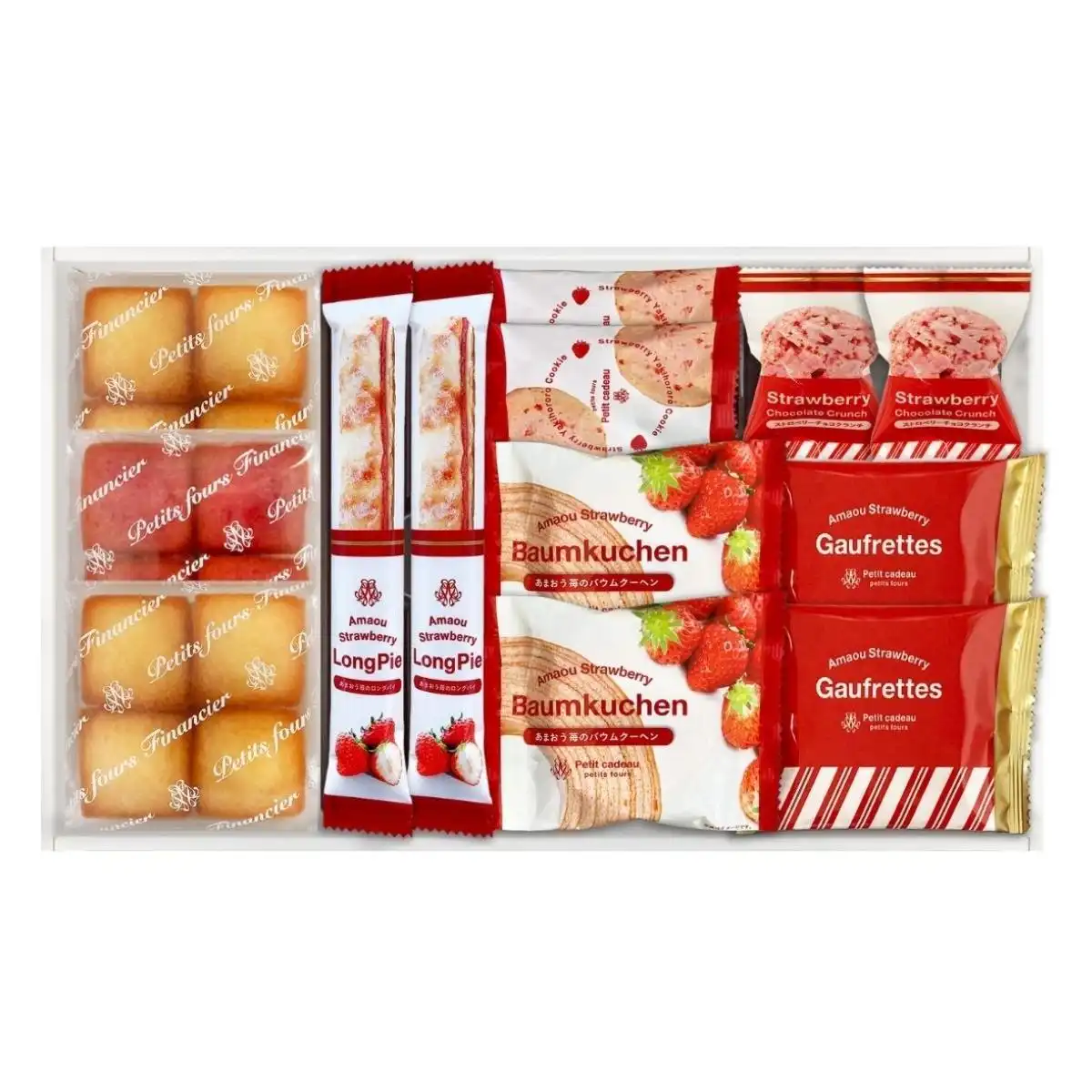 〇商品内容:あまおう苺バウムクーヘン×2、あまおう苺ロングスティックパイ×2、あまおう苺ゴーフレット×2、焼きほろろイチゴクッキー×2、ストロベリーチョコクランチ×2、プチフィナンシェ4個入(あまおう苺、プレーン×2)