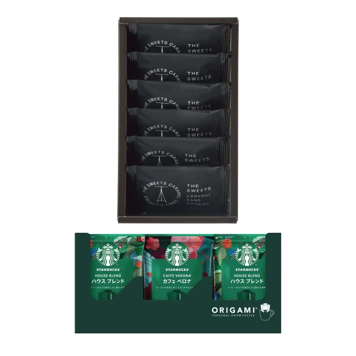 〇商品内容:キャラメルサンド×6、スターバックスオリガミパーソナルドリップコーヒー×5(ハウスブレンド9g×3・カフェベロナ9g×2)