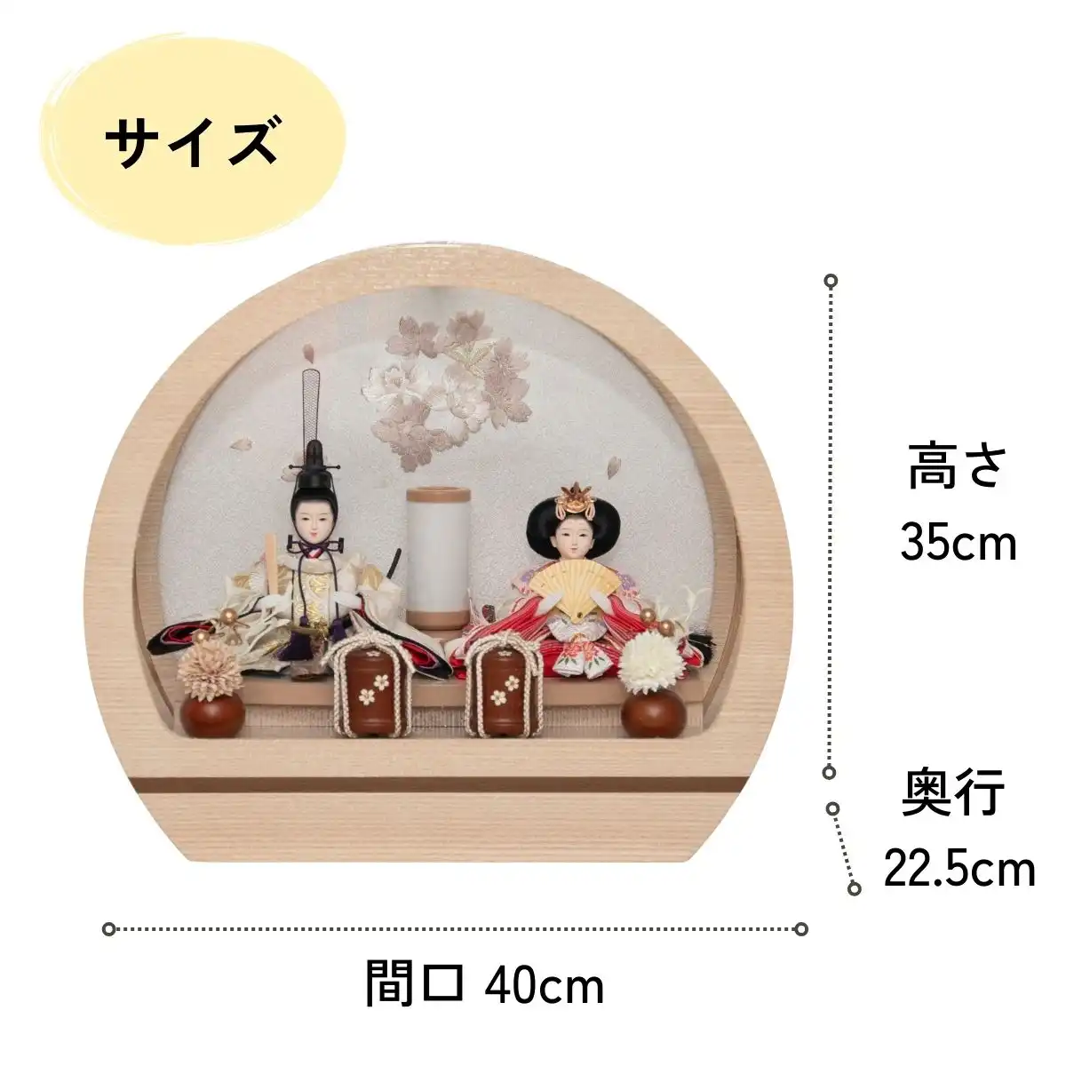 ナチュラルな木目調のケースに美しい衣装と優しい表情のお人形が印象的なケース飾りです。かわいい雰囲気の円形ケースは人気があります。