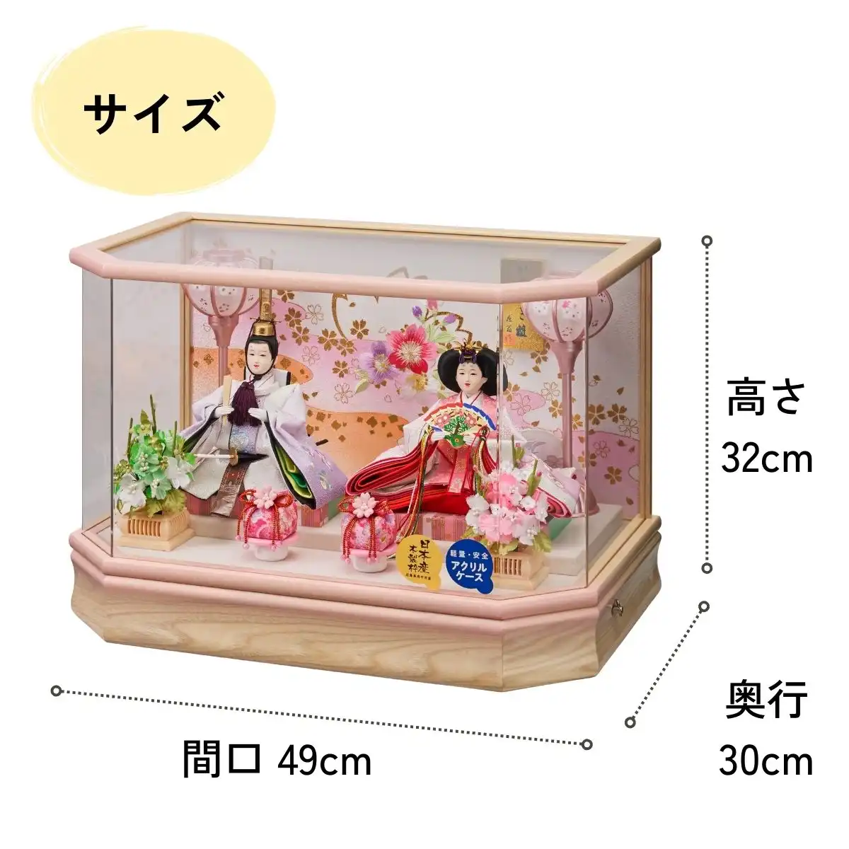 春らしく優しい色合いのケースと、背景の大小様々な桜の花が春の雰囲気を感じさせる仕上がりとなっております。雛人形は手軽に飾ることができて、出した後のお手入れも簡単です。