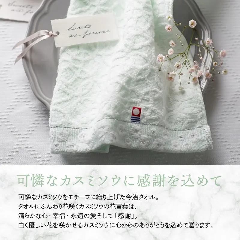 やわらかな糸が奏でる、可憐なカスミソウのように上品でどこか愛らしい今治タオル。ありがとうの気持ちを伝える花束に欠かせないカスミソウには「感謝」という花言葉が付けられました。心からの感謝の気持ちを今治かのんに込めて届けます。