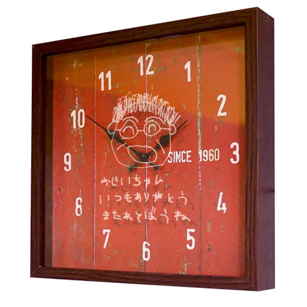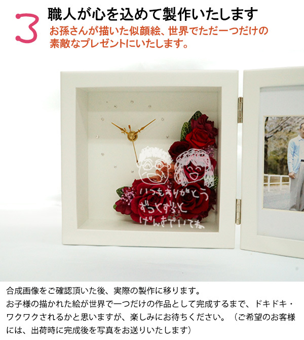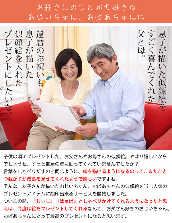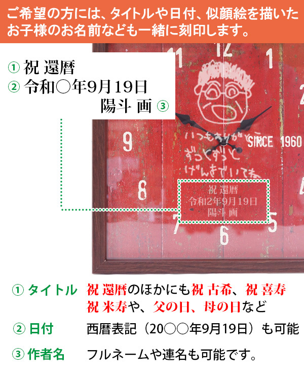 お子様が描いたおじいちゃん、おばあちゃんの似顔絵を、赤い時計のガラス面に刻印いたします。