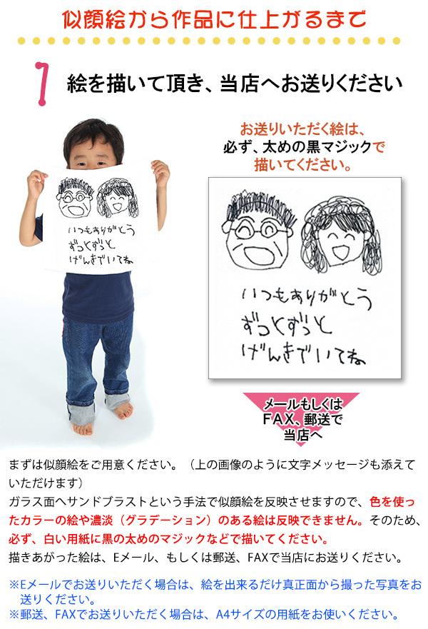 お孫さんが描いた似顔絵をガラス面に刻印します♪